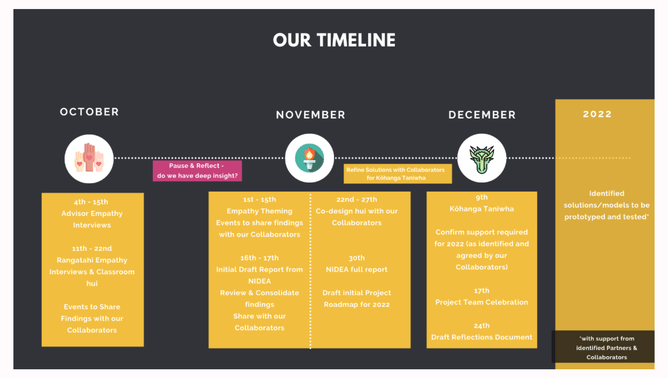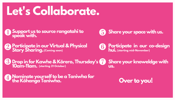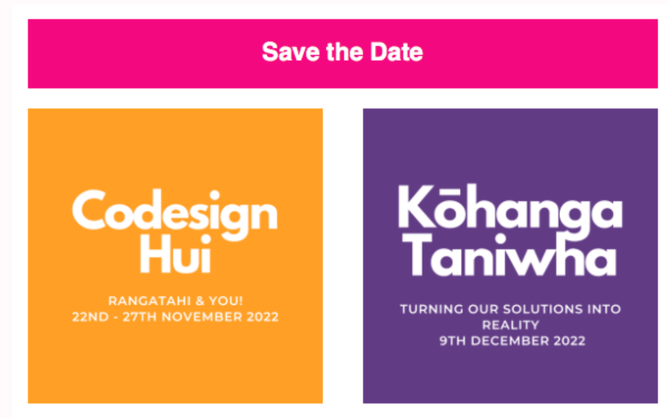 Join the team, rangatahi and other collaborators as we delve into identifying existing and creating new solutions to realise our target. We'll be running a series of Codesign hui across the week.