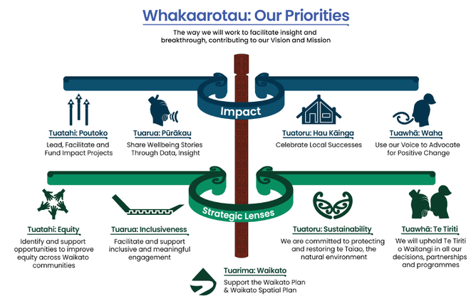 Having explored this, our key lenses are equity (where and for whom are the greatest wellbeing needs), inclusiveness (are we engaging meaningfully and fully?), sustainability (do our actions and priorities protect and enhance the environment?) and Te Tiriti (how do we operate a as treaty-responsive initiative and contribute to Māori wellbeing and a better society for all in a Waikato context?).