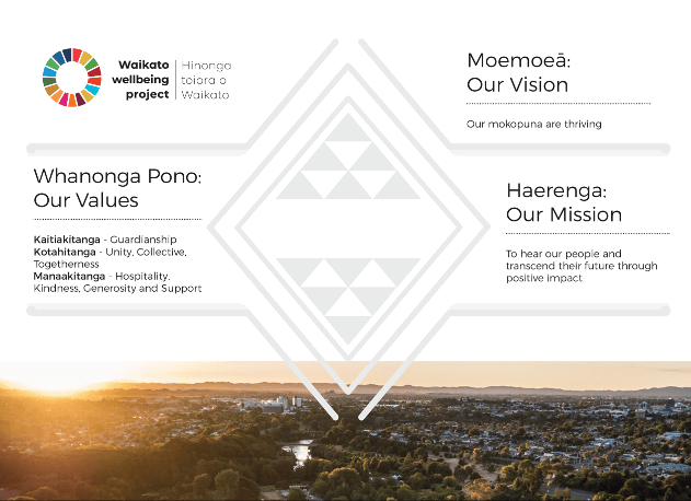 As a result, our new vision | Moemoeā for the Waikato Wellbeing project is “Our Mokopuna are Thriving” and our organisation mission is “To hear our people and transcend their future through positive impact.” Our values remained unchanged: kaitiakitanga, kotahitanga and manaakitanga.