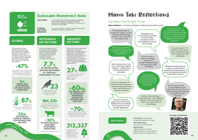 The report recaps the development of the WWP since then, including the development of our core operating model and strategic framework. The report shows the project’s ongoing evolution as we learn more about what drives wellbeing and sustainable development in the Waikato, and what we can do to support those who are leading that change. The report then summarises the Waikato region’s progress against out ten SDG targets and goals, looking at these from a Waikato, Aotearoa | New Zealand and global perspective. Alongside these metrics, we have captured reflections from our manu taki, bringing together both quantitative and qualitative aspects of our wellbeing. By doing this, we hope to provide a broad perspective to readers on some of the dimensions on wellbeing, showing the great progress the region is making, where the challenges still are and what some of the region’s wellbeing leaders really think. An example for SDG 15 (Life on Land) is shown above, which reflections from manu taki Bruce Clarkson.
