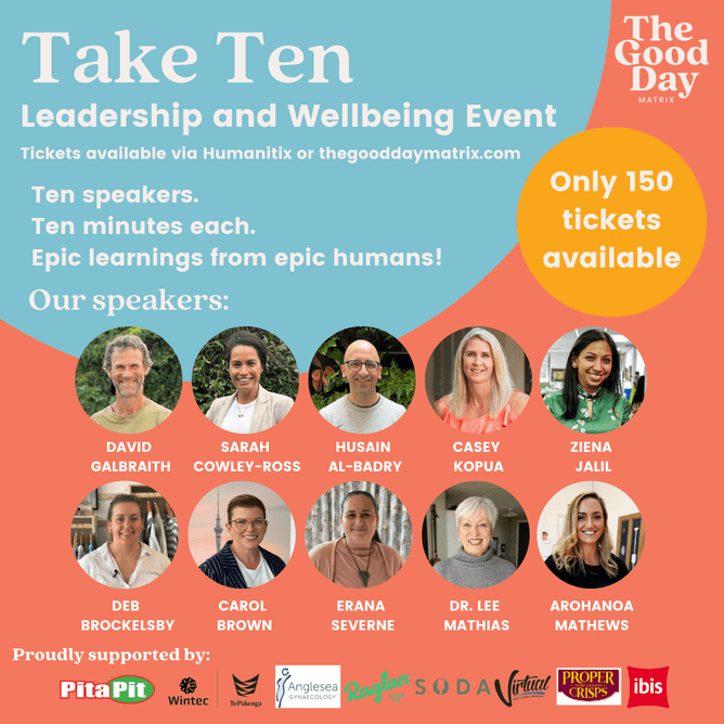 The Good Day Matrix is hosting a Take Ten Leadership Event on Friday 10 November at the Galagher Hub, Te Pukenga (WINTEC) campus in Hamilton. Hear from ten amazing leaders each taking ten minutes to share their leadership stories and insights. Speakers are: