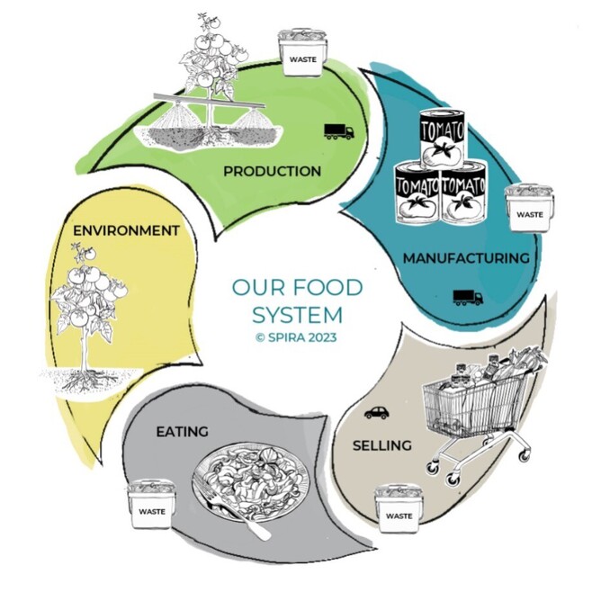 ‘Food systems’ is a term that might mean anything from growing and eating your own strawberries, to huge, global networks, and everything in between. Emily King of Spira suggests thinking of food systems in a circular way, and uses this diagram in her book, ReFood