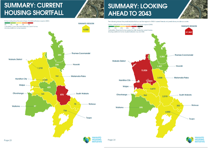Housing shortfall. This report has adopted a household estimate for the Waikato region of ~202,000 homes, which compares to available homes of ~194,000. The resulting housing shortfall for the Waikato region is ~8,000, which is spread unevenly across the region. At the same time the social housing register had ~2,700 families on it, representing families in serious housing need requiring government support. In 2018 there were ~4,400 social housing laces in the Waikato region, which increased to ~5,000 in 2023.Despite the increase in the social housing (~600), the housing register increased from ~900 in 2018 to ~2,700 in 2023. In 2018, demand for social housing exceeded places available by 20%. By 2023, this shortfall had increased to 53%.