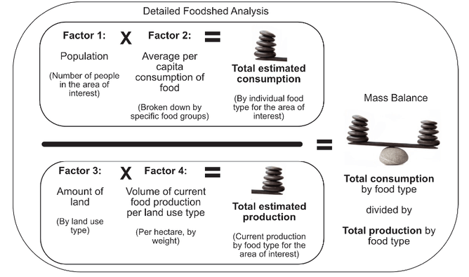 A detailed analysis of the average per capita consumption of food, population, existing land use and estimated food production occurring within the foodshed provides a clear understanding of the types and quantities of food that is produced (maybe in surplus) or that is lacking (not grown at all) within the region.