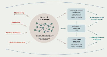 To truly leverage the insights it develops, the WWP needs to find avenues to scale its work upwards to affect policy and structural change and determine how it can scale deeply to better support community initiatives. Additionally, the WWP will need to develop a broader funding base and use a combination of funding sources to deliver its work in the future. The diagram below illustrates the different options for the WWP to take.