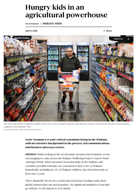 OPINION: While looking at the recent issues around school lunches, it was encouraging to come across the Waikato Wellbeing Project’s report ‘Want Amongst Plenty’ which measures food insecurity in the Waikato and considers possible remedies. Its conclusion is that 9-10% of Waikato households. including 10-12% of Waikato children, face food insecurity at least once a year.