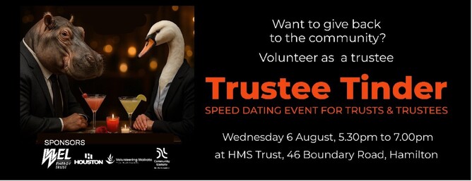 For clarity- this is not a WEL Energy Trust Event but is generously funded by them. “Trustee Tinder” is a light-hearted name used informally for this community event and is not affiliated with or endorsed by Tinder or Match Group, LLC. This event is a local charitable initiative designed to connect prospective trustees with not-for-profit organisations in the Waikato region. No dating involved – just governance matchmaking.