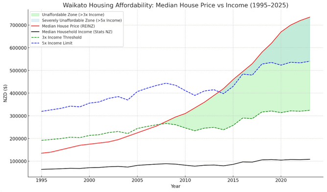 The figure below visualises the growing affordability gap in Waikato's housing market over the past three decades. It compares the median house price (in red) with the median household income (in black), alongside two internationally recognised affordability thresholds: