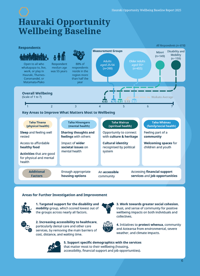 The report presents the findings of the 2024 - 2025 community wellbeing baseline measurement, offering opportunities for effective collaboration, shared learnings, and improved outcomes for the people of Hauraki. Importantly, it enables their voices to be heard, highlighting what matters most to them and their wellbeing, and has been designed so that it can be wielded by community to measure wellbeing longitudinally, should they choose to do so.