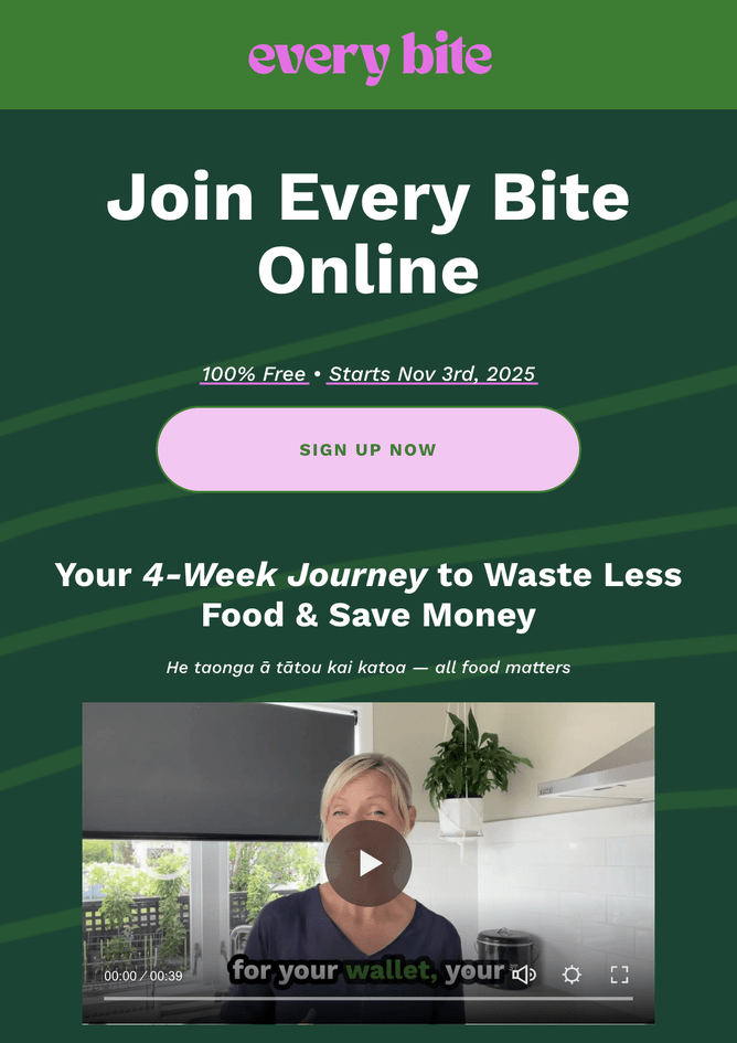 The Every Bite Online Programme is a 4-week transformative journey designed to help participants waste less food and save more—for their wallet, their whānau, and our planet. Led by Waikato sustainability expert Nicola Turner, the programme combines three key elements to create lasting change: