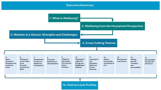 The report has been constructed to look at wellbeing from the household | whanau perspective. This means it explores issues which tend to be most relevant to peoples’ daily lived experiences, and which are also most mentioned by people when asked to rate their own subjective wellbeing. Areas not mentioned in this report are not unimportant for wellbeing, and are addressed in greater detail in other reports such as Waikato Regional Councils Waikato Progress Indicators (WPI). Eleven thematic areas have been selected and are reviewed in the report.