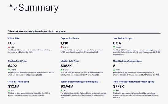 In partnership with Dot Loves Data, the WWP regularly publishes Community Compass reports foreach district in the Waikato region. The reports for Quarter 4 2025 are now available online and can be seen here. The Q4 2025 summary page for Waitomo District is shown below for illustration:
