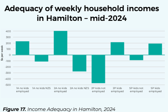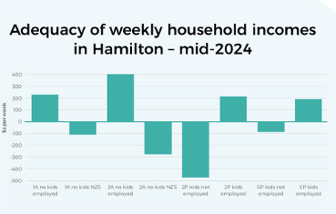 While generalised, the model shows how many common household typologies in Hamilton and the Waikato are experiencing household budget deficits before there are any increases in living costs. For many others, any increases in costs (for example rent, food, fuel or electricity bills) will quickly change their situation from having some additional income each week, to being in deficit. A single event such as a car breakdown or school fees can turn barely getting by, into not having enough for the basics.