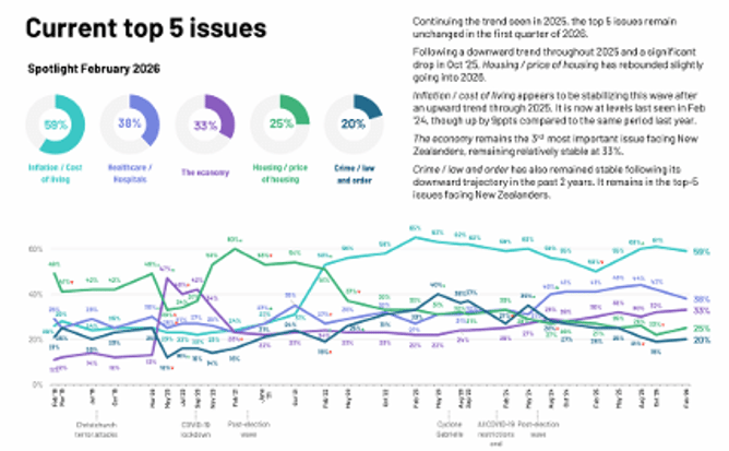 The image beloew shows the most recent results from the regular IPSOS New Zealand Issues Monitor[1]. When asked, the top 5 issues mentioned by New Zealand have been consistent since at least 2019- the cost of living, healthcare, the economy, housing and safety.