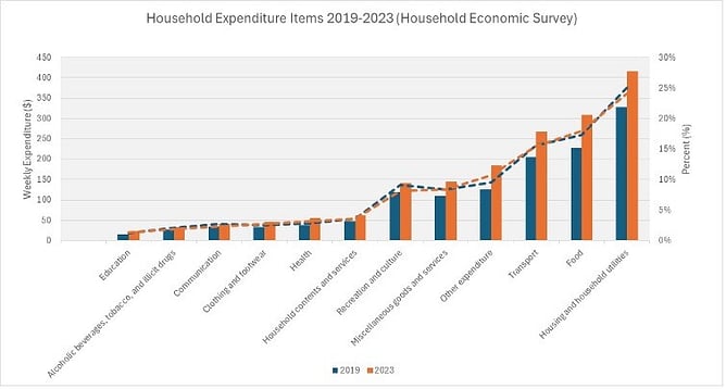 Between 2019 & 2023, average weekly household expenditure increased 18.4%, driven by increases in six spending areas: