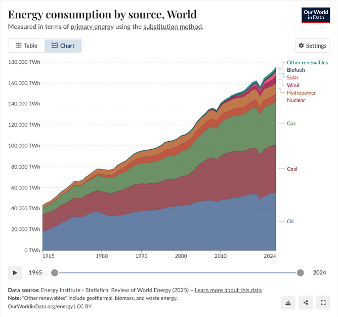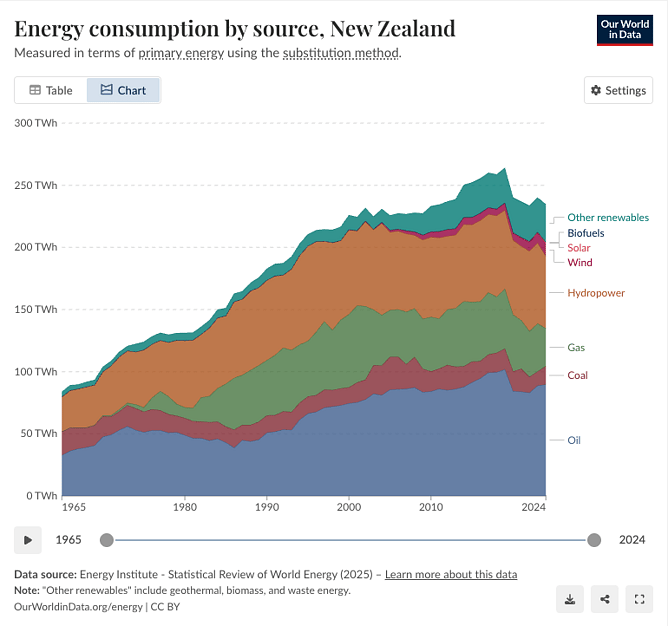 Figure 1. Historical Energy Mix, Global and New Zealand 1965-Present (Our World in Data)