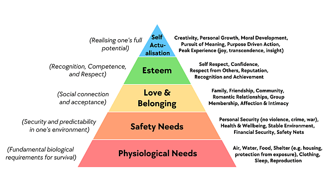 Maslow’s hierarchy of needs frames human wellbeing as a progression from foundational survival requirements to higher-order fulfilment (Figure 3). At its base are physiological needs—food, shelter, and clothing—followed by safety and security, including stable housing and income; only when these are reliably met do people have the capacity to prioritise social belonging, esteem, and ultimately self-actualisation.