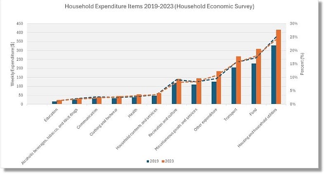 Figure 5 shows data from Household Economic Surveys in 2019 and 2023. It shows that the items which are both most fundamental to household/human wellbeing AND which are identified as being the most important issues to New Zealanders are also amongst the biggest items in the household budget and have experienced the greatest increases in costs over time.
