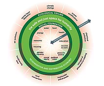 The Doughnut consists of two concentric rings: a social foundation, to ensure that no one is left falling short on life’s essentials, and an ecological ceiling, to ensure that humanity does not collectively overshoot the planetary boundaries that protect Earth's life-supporting systems. Between these two sets of boundaries lies a doughnut-shaped space that is both ecologically safe and socially just: a space in which humanity can thrive.