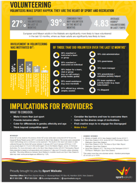 According to the Active Aotearoa | New Zealand Survey 2013/14, 63 per cent of adults in the Waikato region take part in sport and recreation in any given week – significantly below the Aotearoa | New Zealand average of 74 per cent. Only 50% of Waikato survey respondents said they were interested in trying new or doing more sport and recreation activities, lower than every other region and well below the national average of 66%.